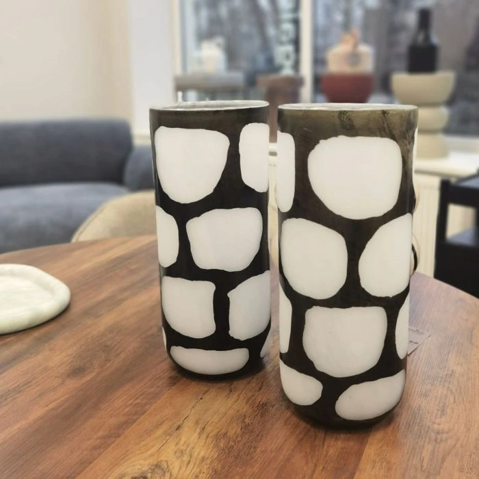 Dekoratīva stikla vāze JAXX ar izteiksmīgu ģeometrisku formu un krāsu pāreju no melnas uz caurspīdīgu. Augstā cilindriskā pamatne pāriet platā astoņstūra augšdaļā.